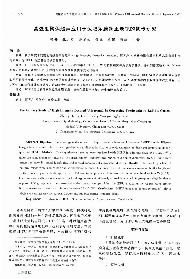 高强度聚焦超声应用于兔眼角膜矫正老视的初步研究