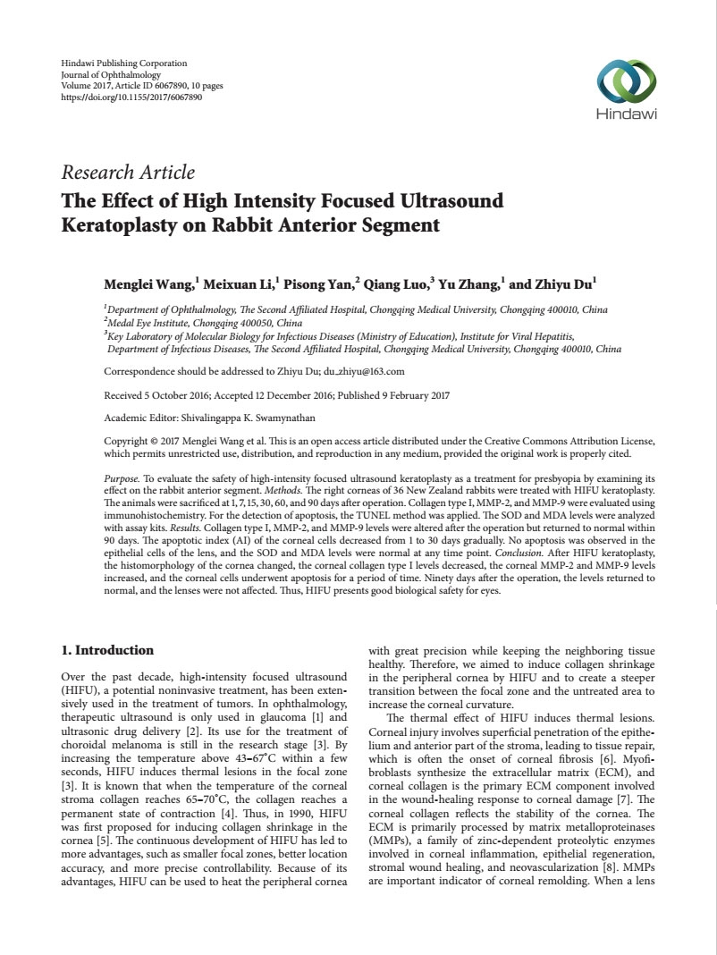 The Effect of High Intensity Focused Ultrasound Keratoplasty on Rabbit Anterior Segment