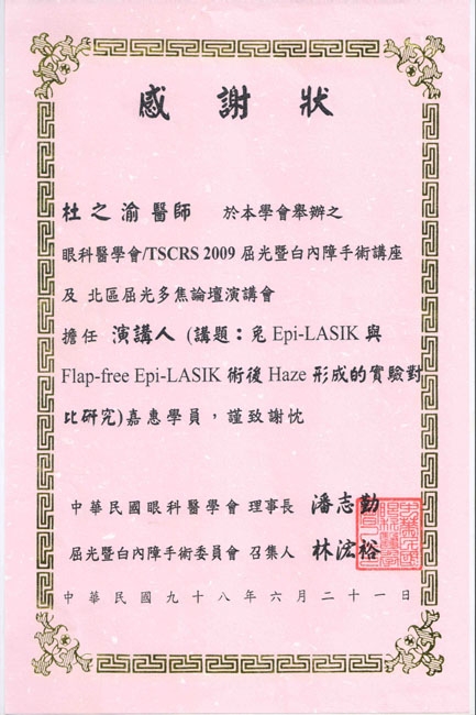 以下感谢状是杜之渝教授在大陆及海外国际会议上作专题讲座后,由大会主委会所颁发