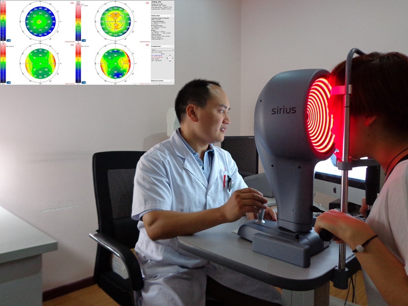 明达眼科医生正在为近视手术患者作Sirius三维角膜地形图检查
