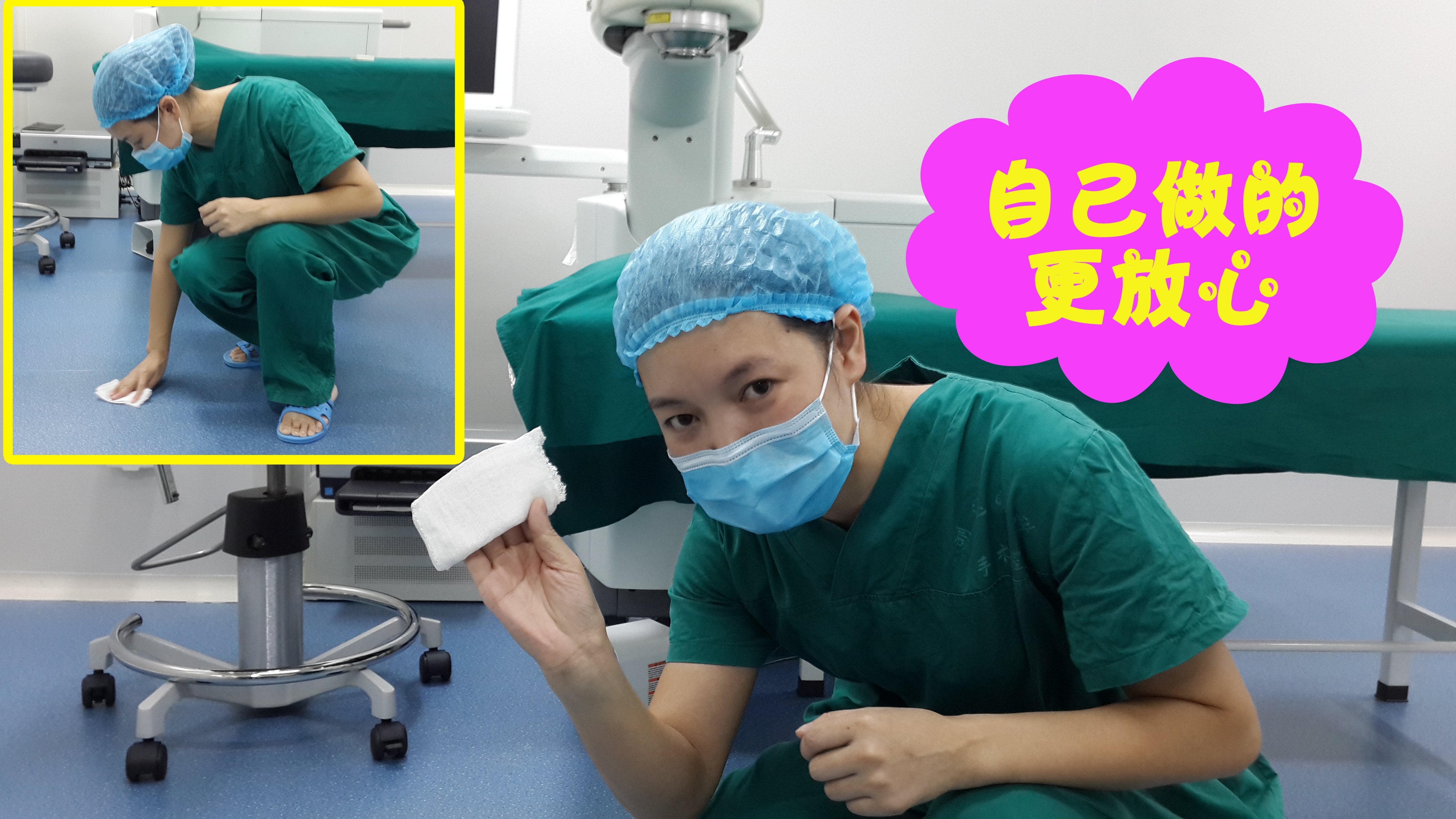 值得一提的是,我们手术室的清洁并不是由保洁人员负责,而是由明达眼科的医护人员自己动手。参观过明达眼科手术室的眼科专家们都称“你们手术室的地面比其他好多地方的桌面都干净!”