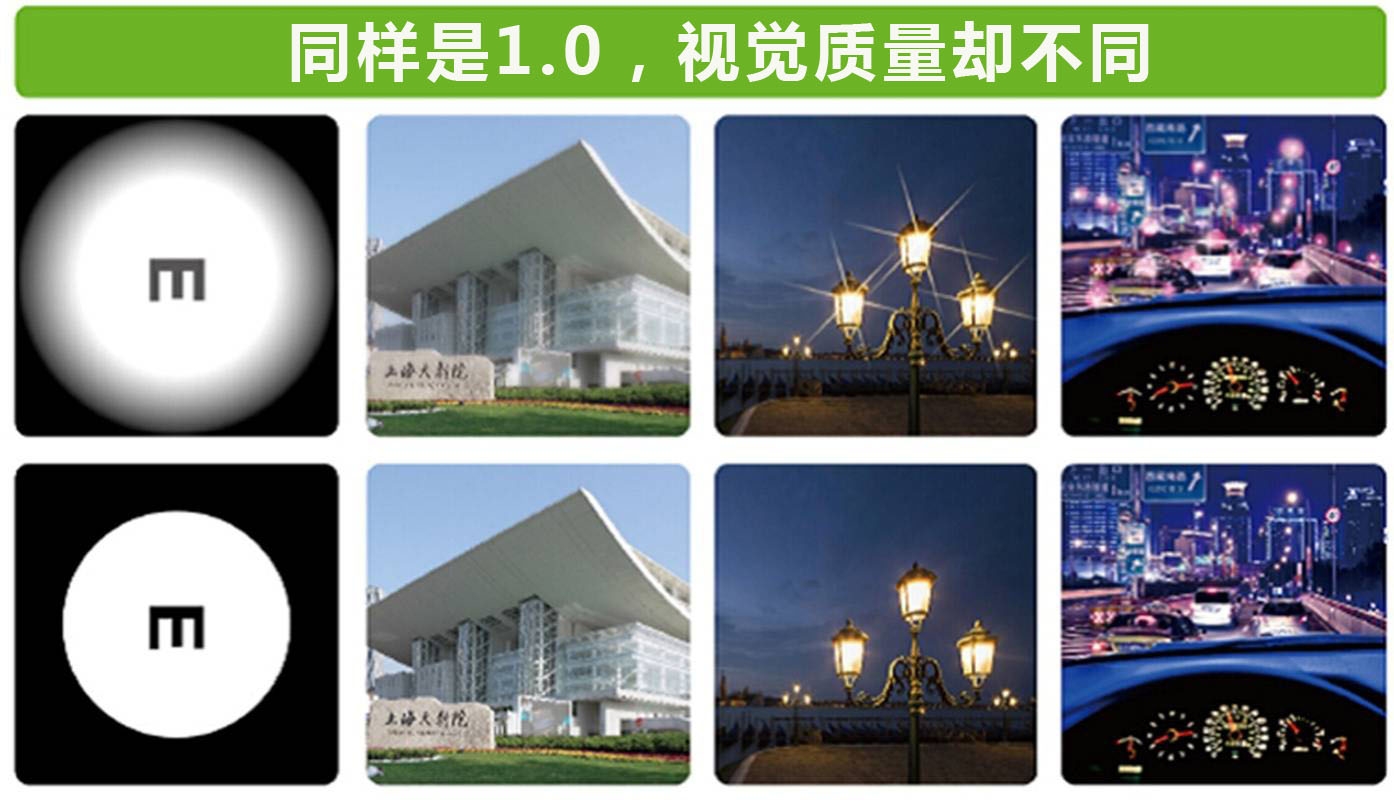 视觉质量差的人,看东西可能出现光晕、对比敏感度下降、星芒、眩光等不适(如上图前一排所示)。而我们追求的是上图第二排中清晰舒适的视觉体验。