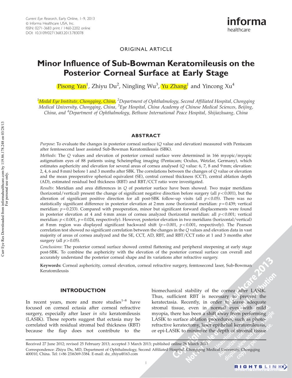 Minor Influence of Sub-Bowman Keratomileusis on the Posterior Corneal Surface at Early Stage