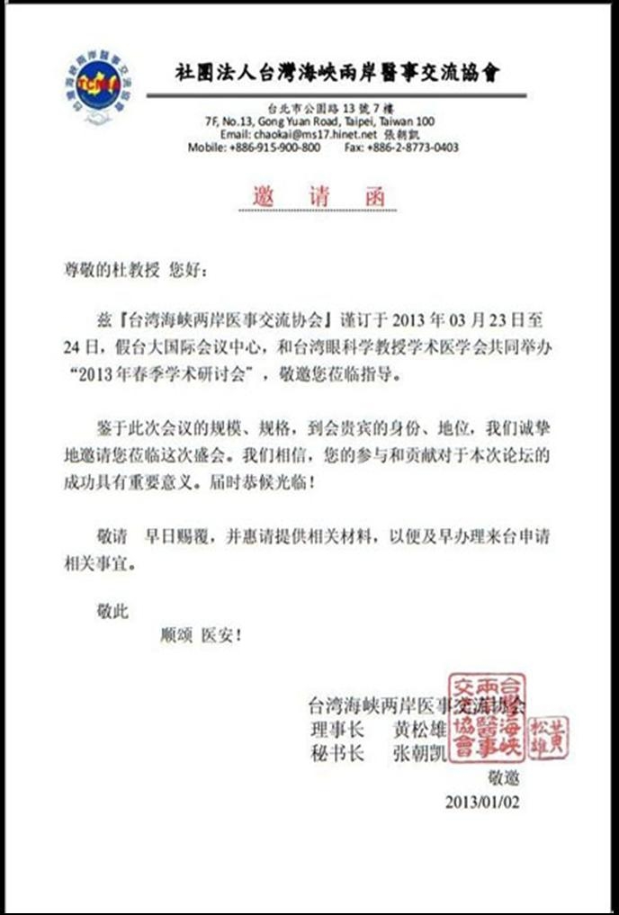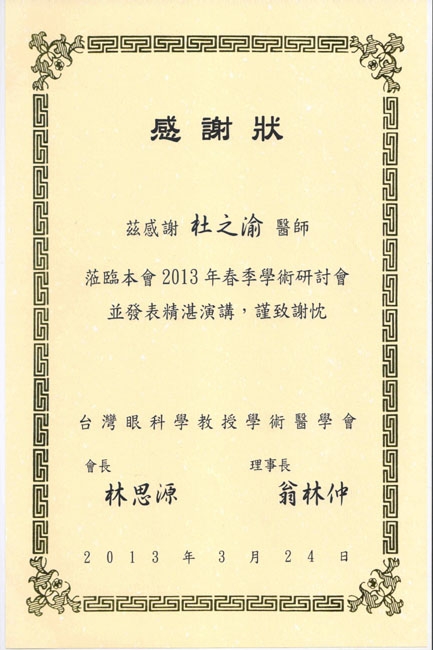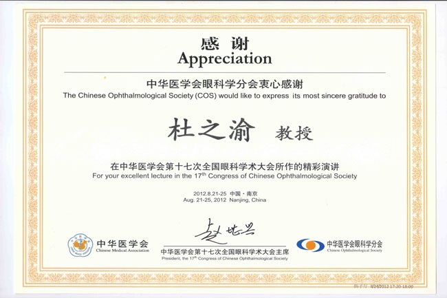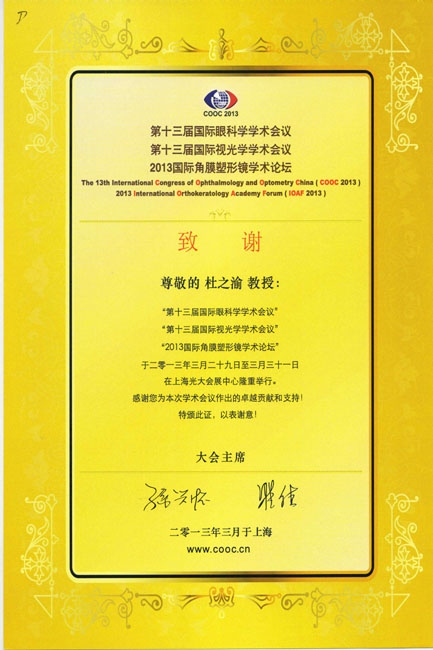 以下感谢状是杜之渝教授在大陆及海外国际会议上作专题讲座后,由大会主委会所颁发