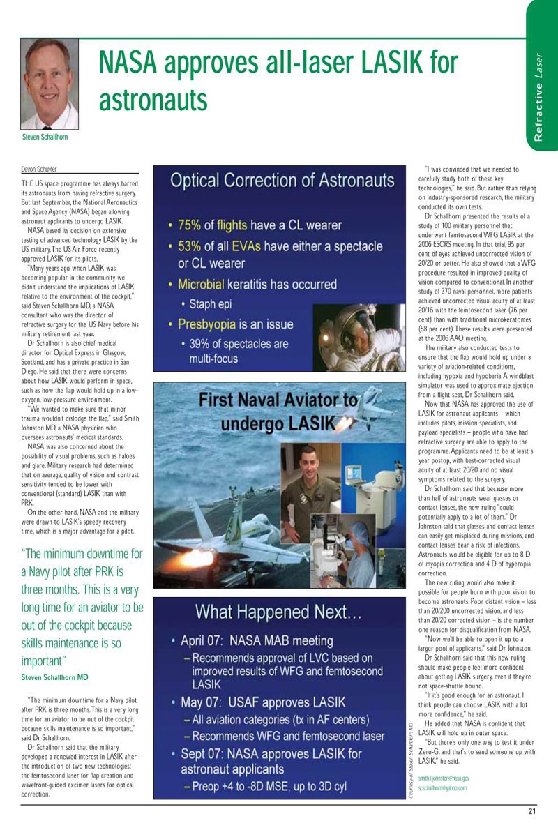 据眼科杂志《欧洲时代》报道,美国国家航空航天局(NASA)基于广泛的军方临床数据,核准全激光LASIK手术,即iLASIK手术可用于在太空飞行的宇航员,以及执行军事任务的空军飞行员。被誉为美国Steven Schallhorn博士是NASA及军方鹰眼计划主持人,在接受眼科权威杂志《欧洲时代》记者Devon Schuyler访问时说:“NASA的决定是基于普遍的军方临床数据而来,AMO Advanced CustomVue(波前像差技术)和Intralase®(飞秒激光技术)的结合保证了LASIK手术极高的安全性和有效性。” Steven Schallhorn博士还谈到,“经过有效临床数据的施行与报告,iLASIK手术——全激光准分子手术在安全性和有效性、视力质量调整及夜间驾驶效能的视力改善技术上已纯熟,手术过后的视力稳定度在无重力、低氧浓度、干燥的太空环境中经测试也未受影响,未来评选航天员资格时视力将不再是问题。NASA的批准进一步验证了目前iLASIK手术超越了现有近视治疗手术的安全性和有效性标准”。