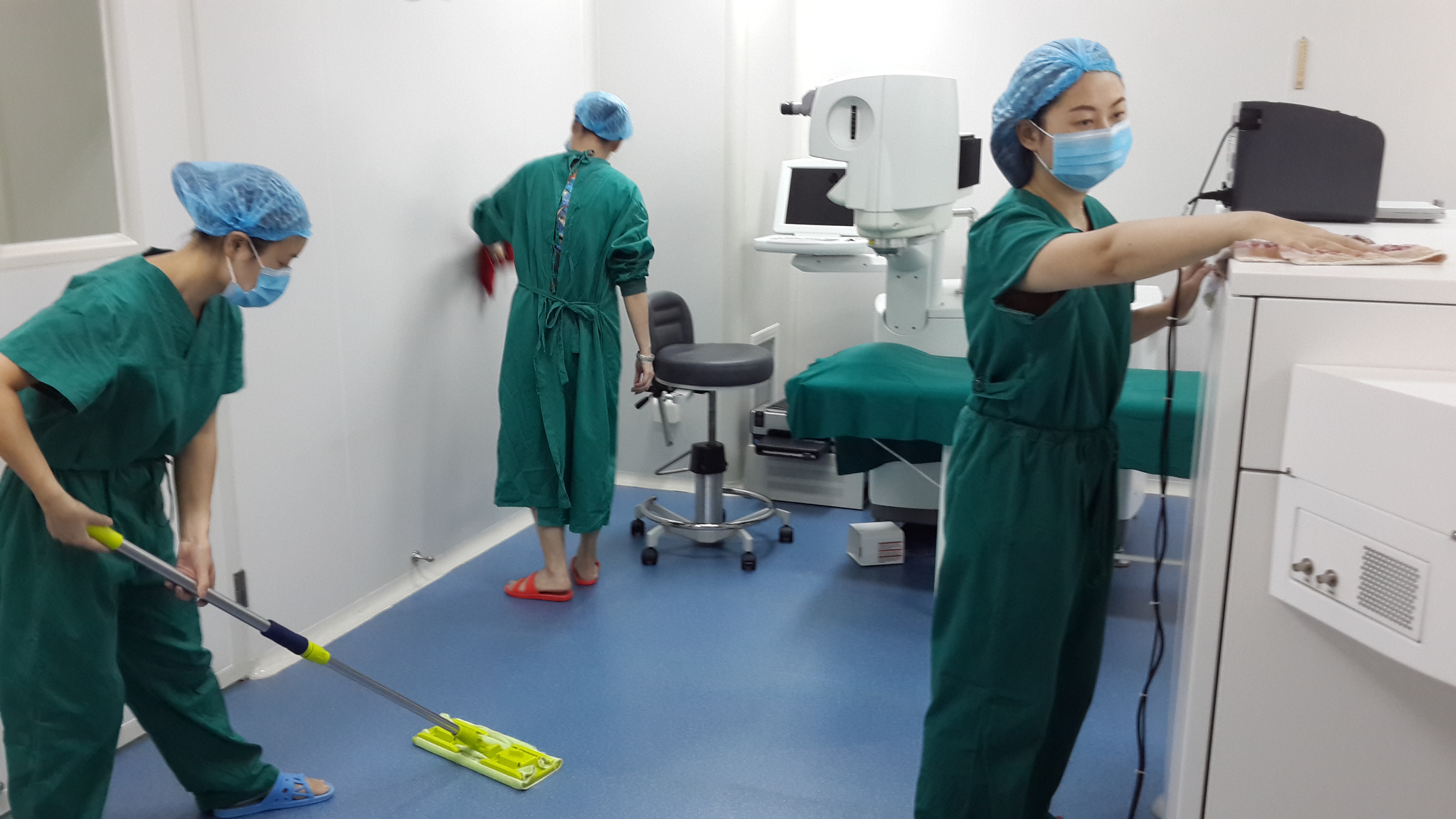 值得一提的是,我们手术室的清洁并不是由保洁人员负责,而是由明达眼科的医护人员自己动手。参观过明达眼科手术室的眼科专家们都称“你们手术室的地面比其他好多地方的桌面都干净!”