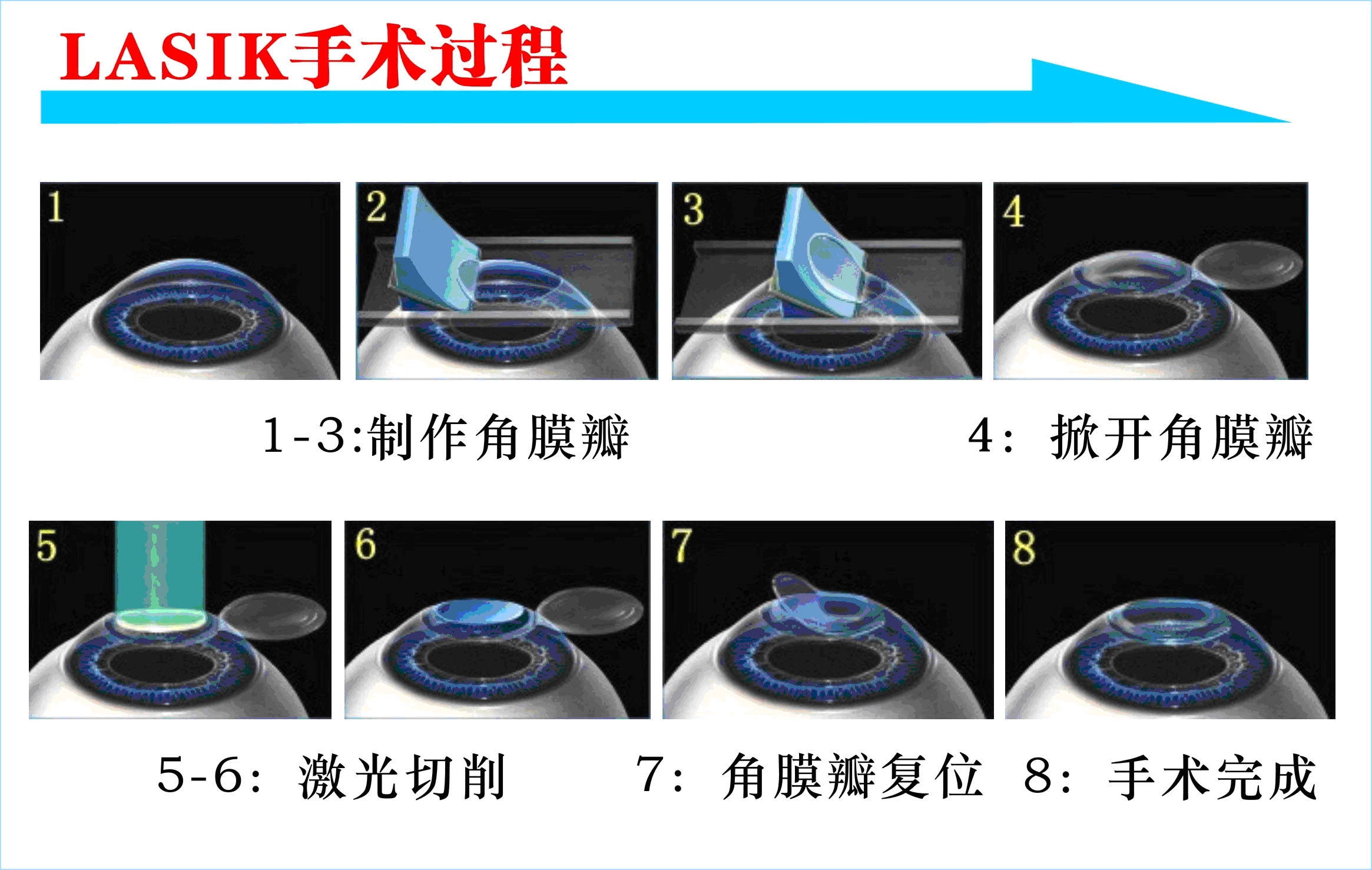 LASIK手术(即准分子激光近视手术)的原理是用一种特殊的微型角膜板层切割系统(简称角膜刀)将角膜表层组织制作成一个带蒂的圆形角膜瓣,翻转角膜瓣后,在计算机控制下,用准分子激光对瓣下的角膜基质层拟去除的部分组织予以气化,精确度达到0.25μm,然后于瓣下冲洗并将角膜瓣复位,以此改变角膜前表面的形态,调整角膜的屈光力,达到矫正近视、远视或散光的目的(见图1)。